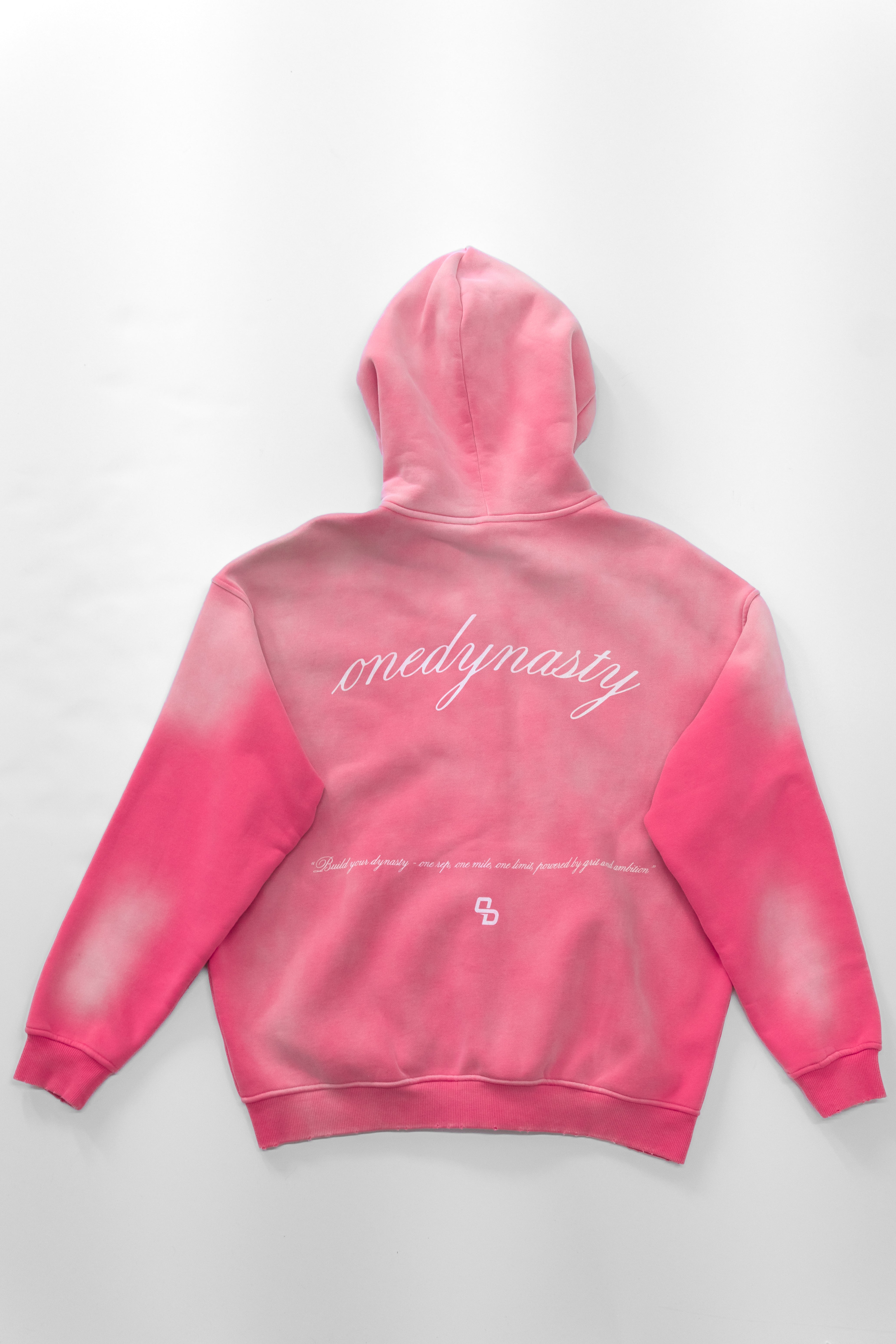 Relaxed fit cotton blend double-zipper hoodie with onedynasty signature logo on the back, plain front. Washed fading throughout.