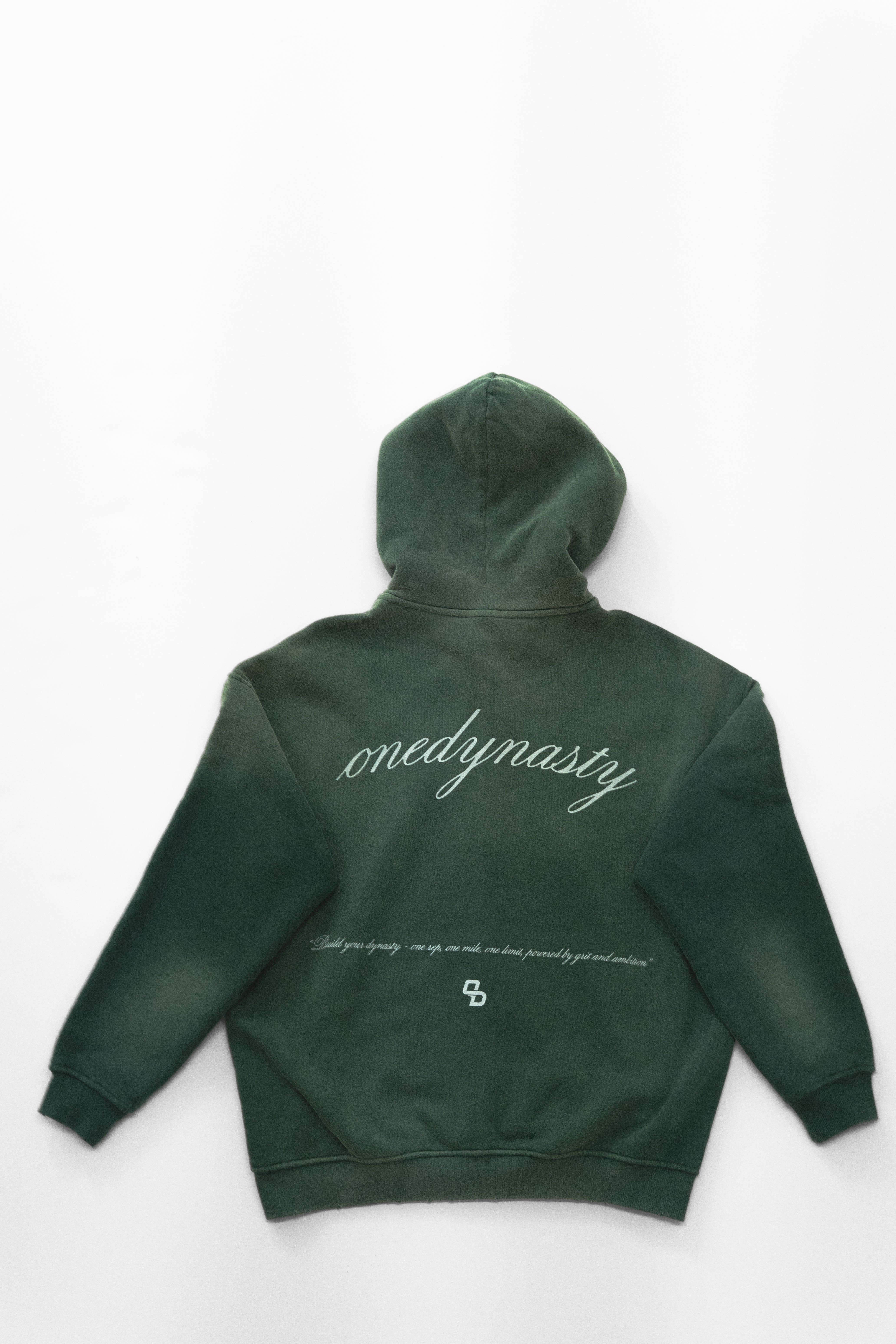 Relaxed fit cotton blend double-zipper hoodie with onedynasty signature logo on the back, plain front. Washed fading throughout.